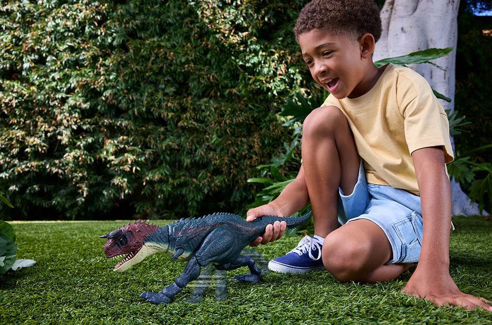 Η φιγούρα δεινόσαυρου Jurassic World Καρνόταυρος προσφέρει συναρπαστική δράση με ρεαλιστική κίνηση, δαγκώματα και ήχους γρυλισμού. Τα πολυαρθρωτά πόδια του κινούνται με ρεαλιστικό τρέξιμο, που ενεργοποιείται με ένα κουμπί στη βάση της ουράςΤο τρέξιμο το θέτει σε θέση επίθεσης και τα δαγκώματα παρέχουν άμυνα. Αυτό το παιχνίδι δεινόσαυρος με πολλαπλές λειτουργίες είναι έτοιμο για διασκεδαστικές μάχες. Σαρώστε τον κωδικό παρακολούθησης στο πόδι του δεινοσαύρου στην δωρεάν εφαρμογή Jurassic World Play με μια συμβατή έξυπνη συσκευή (Android ή iOS, δεν περιλαμβάνεται) για να ξεκλειδώσετε μια ψηφιακή έκδοση του δεινοσαύρου και να παίξετε διασκεδαστικό παιχνίδι με αγώνες οχημάτων σε ξηρά, αέρα και θάλασσα. Κατάλληλο για λάτρεις των δεινοσαύρων ηλικίας 4 ετών και άνω. Διατίθενται πολλά είδη, το καθένα πωλείται ξεχωριστά, ανάλογα με τη διαθεσιμότητα. Τα χρώματα και οι διακοσμήσεις μπορεί να διαφέρουν.