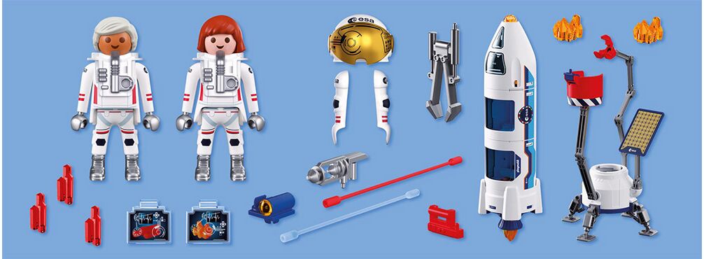 Δημιουργήθηκε σε συνεργασία με τον Ευρωπαϊκό Οργανισμό Διαστήματος (ESA) – Η PLAYMOBIL φέρνει τη γοητεία της διαστημικής έρευνας μέσα στα παιδικά δωμάτια! Δύο αστροναύτες προσγειώθηκαν με ασφάλεια στον Κόκκινο Πλανήτη με τον ερευνητικό τους πύραυλο – έτοιμοι να συλλέξουν δείγματα εδάφους και να τα μεταφέρουν στη γη! Ο πύραυλος μπορεί να προσαρμοστεί: Μπορεί να μεγαλώσει ή να μικρύνει το μήκος του ανάλογα με την αποστολή και μπορεί να συνδεθεί στην κινητή πλατφόρμα προσγείωσης που χρησιμεύει ως σταθμός στον Άρη. Οι κινούμενοι βραχίονες του πυραύλου βοηθούν στη συλλογή των δειγμάτων από το έδαφος και στην ασφαλή αποθήκευσή τους πριν την απογείωση – είτε στον μπροστινό χώρο αποθήκευσης είτε στο ειδικά διαμορφωμένο ρύγχος. Ο πύραυλος έχει καθίσματα και για τους δύο αστροναύτες. Ετοιμαστείτε για εκτόξευση – η επόμενη αποστολή PLAYMOBIL ξεκινά!