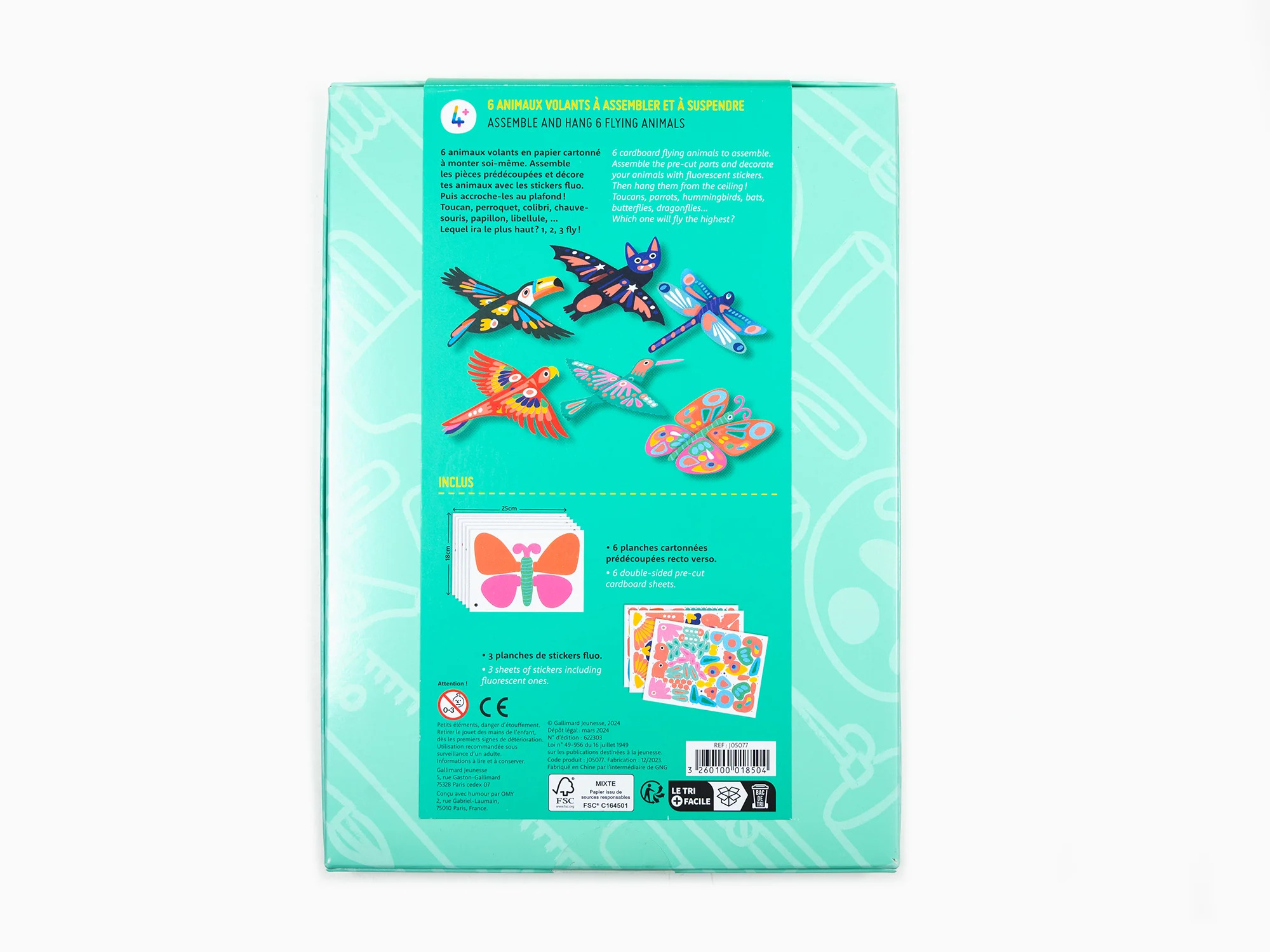 Συναρμολογήστε 6 χάρτινα ιπτάμενα ζώα. Ενώστε τα προκομμένα κομμάτια και διακοσμήστε τα ζώα σας με τα φωσφορίζοντα αυτοκόλλητα. Έπειτα, κρεμάστε τα από το ταβάνι!