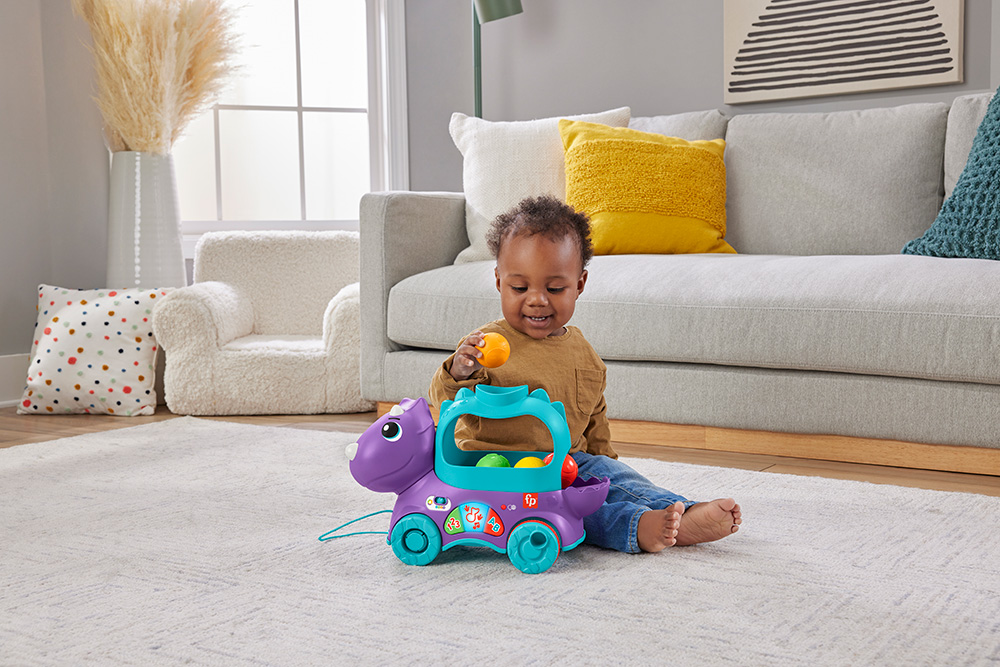 Τώρα τα νήπια μπορούν να ταξιδέψουν στα προϊστορικά χρόνια παρέα με αυτό το χαριτωμένο δεινοσαυράκι της Fisher-Price®. Καθώς το παιδί τραβάει ή σπρώχνει το δεινοσαυράκι, οι χρωματιστές μπαλίτσες θα χοροπηδούν στην πλάτη του. Για περισσότερη διαδραστική διασκέδαση, τα μικρά παιδιά μπορούν να πατήσουν τα 3 κουμπιά για να ενεργοποιήσουν εκπαιδευτικά τραγουδάκια, ήχους και φράσεις σχετικά με το αλφάβητο, την αρίθμηση και τα χρώματα. Πιέστε το κουμπί "υδρόγειο" για να διαλέξετε γλώσσα Αγγλικά, Τούρκικα ή Ελληνικά